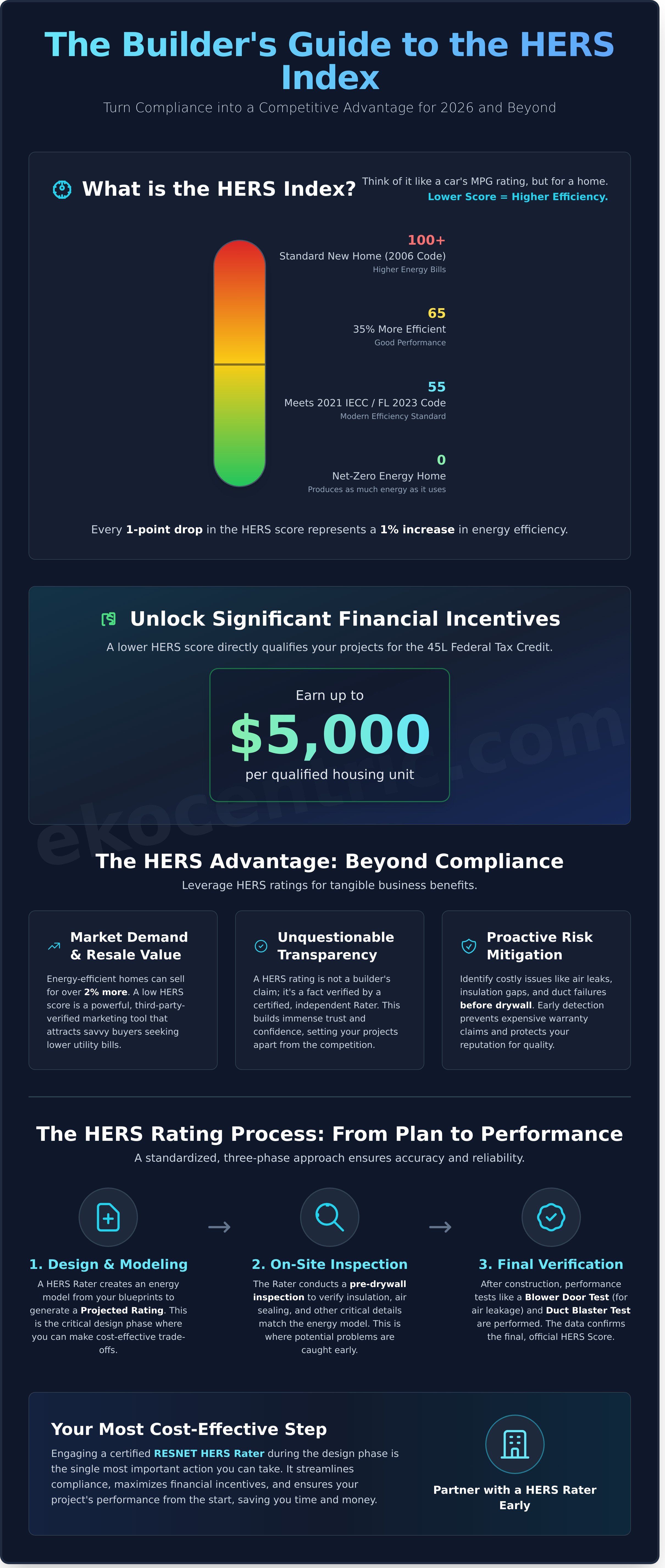 Finally, integrating renewable energy is the most direct path to a single-digit HERS score. A properly sized solar PV array can offset a home’s entire energy consumption, pushing its score toward Net-Zero. This not only dramatically improves the HERS Index but also positively impacts the HERSH2O score by providing clean energy for electric water heating. A comprehensive HERS index explained for builders must include these actionable steps. The key is ensuring your subcontractors understand their role. From the framer to the electrician, every trade must be trained on how their work contributes to the home’s performance. One poorly sealed window can compromise the entire envelope. Let our certified HERS Raters guide your next project to a lower score and higher value. Partner with Ekocentric today.
