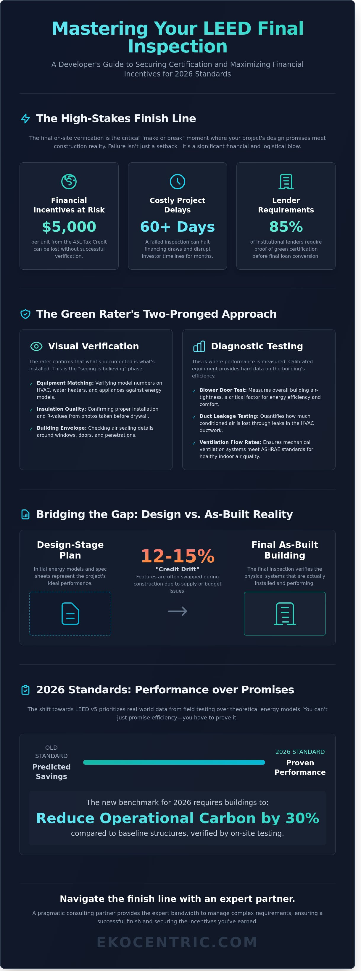 Preparing for a LEED final inspection is a high-pressure milestone because it's the gatekeeper to significant financial incentives. Projects failing to meet thresholds during this visit risk losing out on the 45L tax credit, which provides up to $5,000 per unit for energy-efficient homes. A failed inspection can also trigger a 60-day delay in certification, which stalls financing draws and disrupts investor timelines. In a market where 85% of institutional lenders require green certification proof before final loan conversion, the stakes couldn't be higher.
