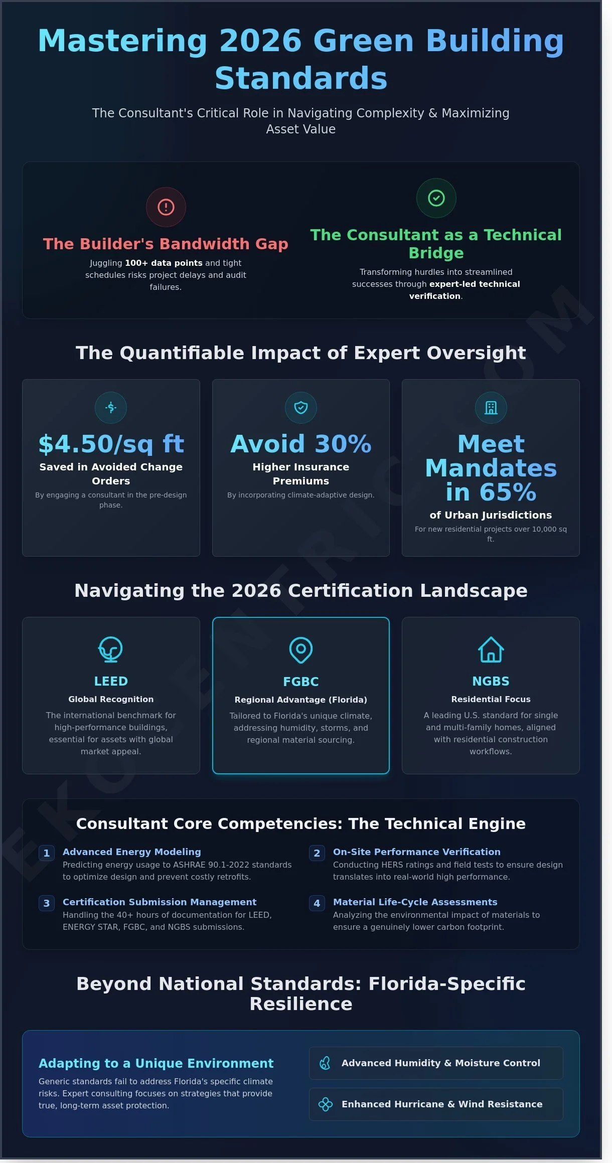 In 2026, the consultant is a project-critical risk manager. We don't just check boxes at the end of a build. We enter the project during the pre-design phase to prevent costly retrofits. Research from early 2025 shows that involving a consultant before the first shovel hits the ground can save a developer $4.50 per square foot in avoided change orders. We act as the primary liaison between the owner, the design team, and certifying bodies like the USGBC or the Florida Green Building Coalition.